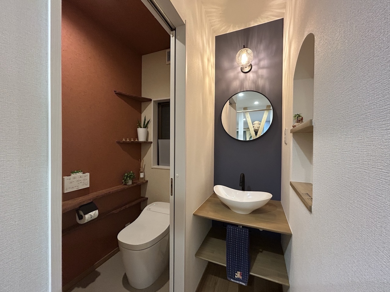 見渡してみて分かると思うんですが、リビングはもちろん、トイレや洗面所も、いろんな壁紙が貼ってあるでしょう? それから、作り付けの棚や台、ちょっと雰囲気の良い洗面台など、こんなに自由に選べるのかっていうくらい、楽しませてもらいました。